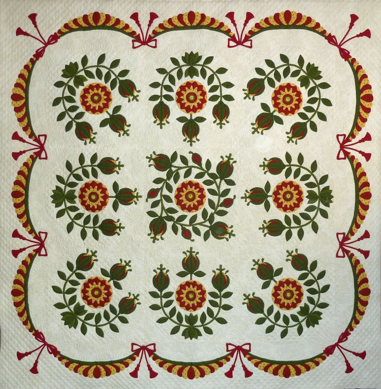 Borrowed Roses is an adaptation of the New Rose Tree quilt made in 1928 by the grande dame of Kansas quilters, Rose Frances Good Kretsinger. The beauty of this quilt is found in its striking simplicity.? Because the blocks are large (22 inches) and the fabrics are limited to five prints and a background fabric, this quilt is an easy to gather the fabric for and to make.? Sue Garman assures us that the feathered swag border is one of the easier applique borders she has ever made.? The detail photo shows the beautiful quilting that makes this quilt a stand-out in a crowd.? Rose Kretsinger designed all the quilting patterns in her quilts - and Sue replilcated that design in her own quilt.? The finished quilt measures 86 by 86 inches.?